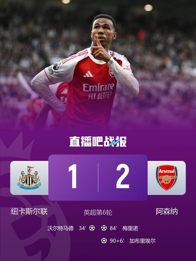 梅里诺头球扳平比分,补时阶段加布里埃尔绝杀!最终,阿森纳2-1逆转纽卡,距离榜首2分。