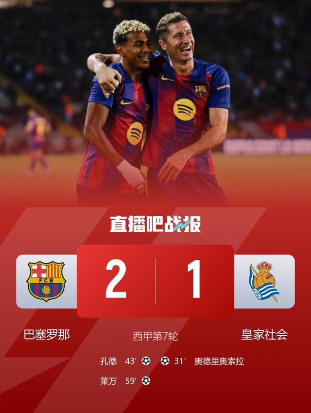 孔德扳平,亚马尔助攻莱万破门,最终巴萨2-1逆转皇家社会,1分优势领跑积分榜。