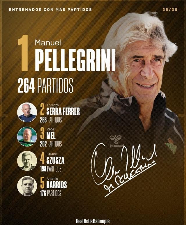 佩莱格里尼迎来自己执教贝蒂斯的第264场比赛,这让他超越洛伦佐-塞拉-费雷尔成贝蒂斯队史执教场次最多的主教练。