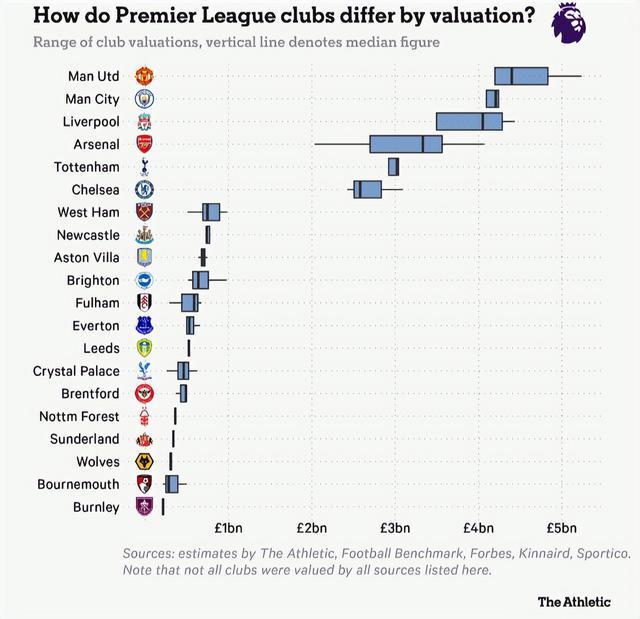 这些身价区间的数据,综合了TA、足球基准(Football Benchmark)、福布斯(Forbes)、金奈德咨询(Kinnaird)以及体育财经网(Sportico)的估值结果。